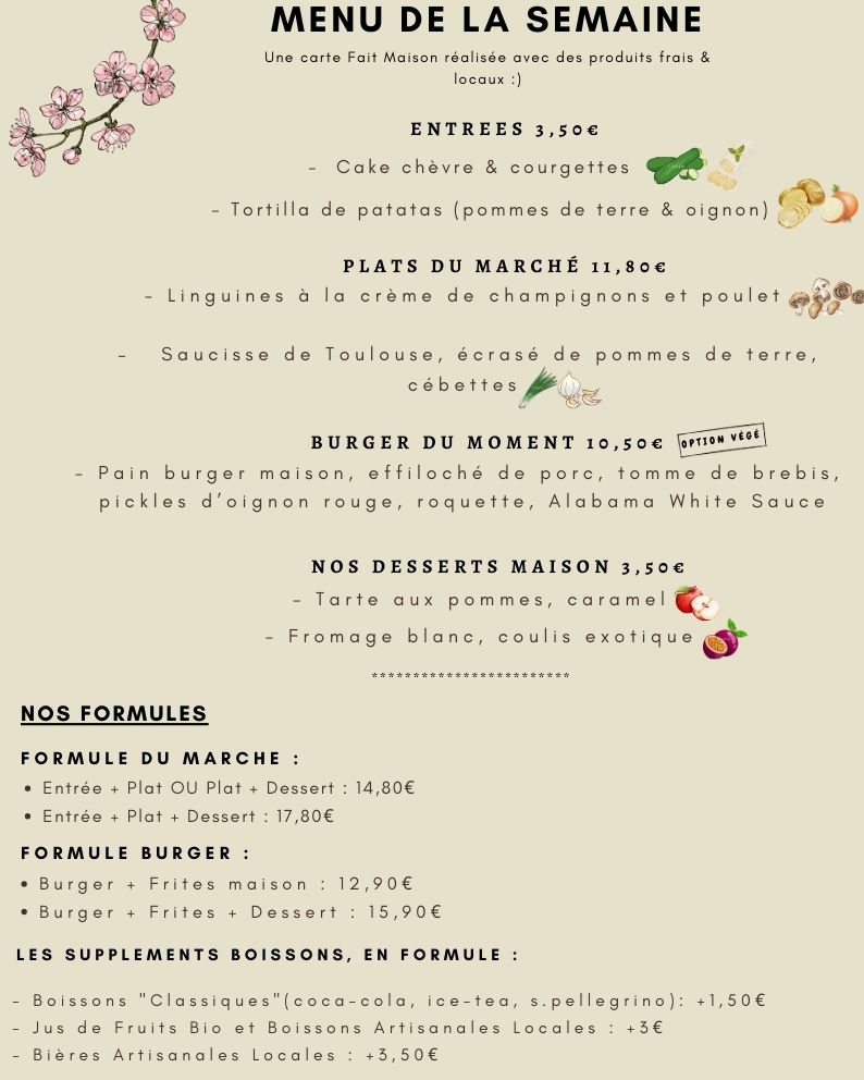 Découvrez notre menu de la semaine ! Une carte renouvelée toutes les semaines, avec des produits frais, de saison et principalement issus de producteurs locaux.